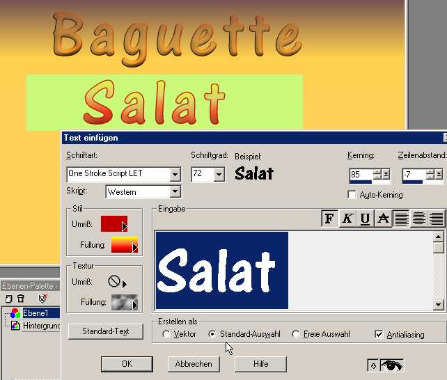 nur bei der Standard-Auswahl zur Verfügung steht. Das wollen wir jetzt mit der Texteinfügung “Salat” ausprobieren. |